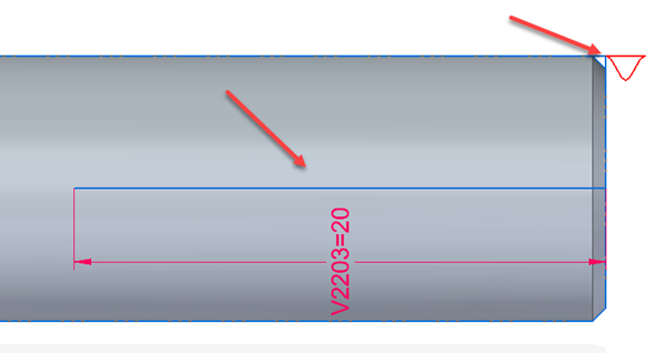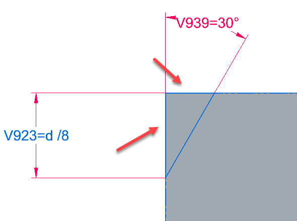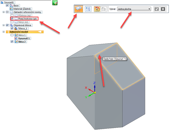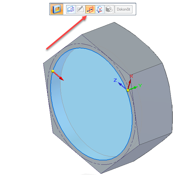 Příkaz Skica aplikujte na referenční rovinu Pravý bokorys (yz) a příkazem Protmítnout do skicy si promítněte plochu jak je znázorněno na obrázkuNaorientujte se na levý pohled a promítnutou skicu příkazem Konstrukční změňte na konstrukční čáru, nakreslete čáru spojující dvě strany a nastavte hodnotu kóty na d/8Nastavte svírající úhel na hodnotu 30° dle strojnických tabulek a příkazem Čára nakreslete zbývající čáry, aby byl uzavřený řetězNakreslete čáru podél osy Y a uzavřete skicu. Ze záložky Domů → Tělesa vyberte příkaz Vyříznutírotací, označte trojúhelníček a jako osu zvolte čáru podél osy Y, úhel nastavte na 360° a potvrďte zeleným tlačítkemPromítněte skicu a změňte na konstrukční čáru dle obrázkuNakreslete kružnici dle obrázku a zakótujte na hodnotu d/16Ukončete skicu a ze záložky Domů → Tělesa vyberte příkaz Vyříznout. V plovoucím okně zvolte Vyříznout – Strana a směr zevnitř. Výběr potvrďte pravým tlačítkemHodnotu vyříznutí nastavte na 0,15 mmDle obrázku nakreslete kružnici a nastavte kótu na dUkončete skicu a vysuňte dřík na hodnotu 45 mm, zkoste ukončení dříku na 0,5 mm