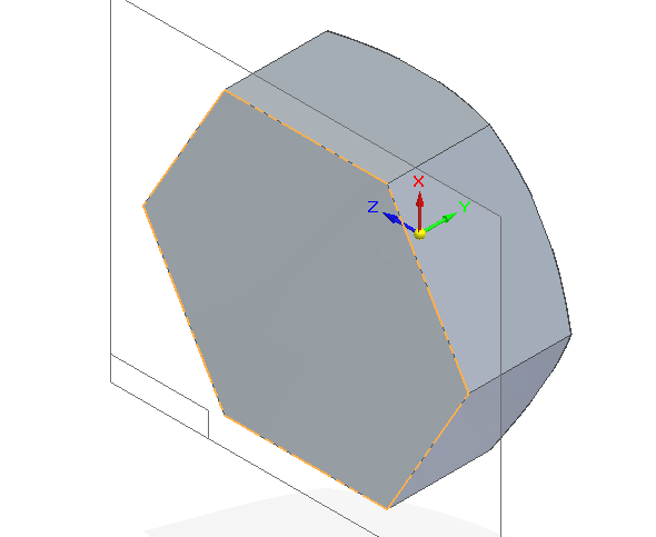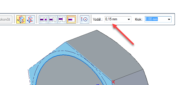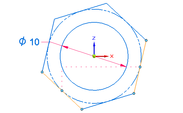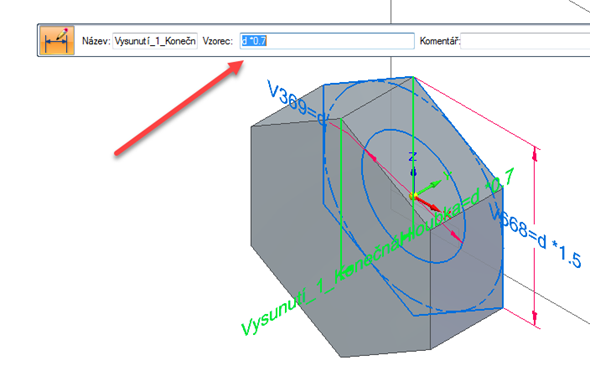 Ze záložky Domů → Kreslit vyberte příkaz Polygon středem a vytvořte polygon o 6 stranáchVazbou Vodorovně/svisle si zarovnejte strany a zakótujte na rozměr dle vzorce d*1,5Zavřete skicu a vysuňte na rozměr d*0,7