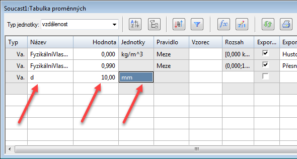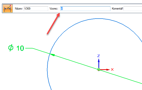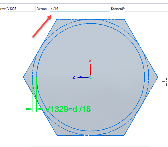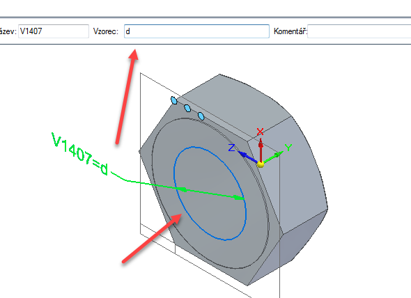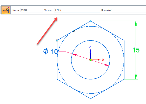 Založte nový dokument iso metric part.parV záložce Nástroje zvolte funkci ProměnnéDo prázdného pole Název napište (dvojklikem levého tlačítka) d, stejným způsobem vepište hodnotu 10 a jednotky mm. Tabulku proměnných zavřeteNakreslete kružnici o průměru d