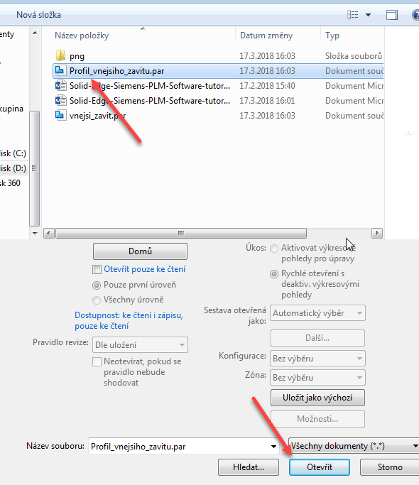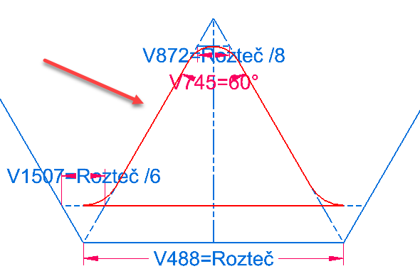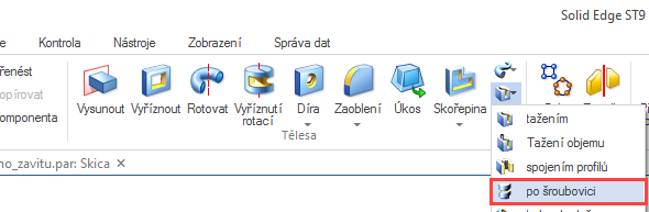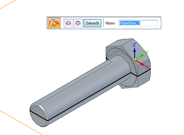 Ze záložky Tvorba ploch → Křivky vyberte příkaz Průsečík a klikněte na šroub, poté klikněte na referenční rovinu Půdorys (xy), tím vznikne průsečnicePromítněte do skici vzniklou průsečnici a změňte ji na konstrukční čáru, dokreslete čáry dle obrázku a změňte na konstrukční čáryOtevřete soubor Profil_vnejsiho_zavitu.par, který jsme vymodelovali v minulém návodu Profil vnějšího závituS držením klávesy Ctrl klikněte na všechny červeně označené čáry a klávesovou zkratkou Ctrl + C zkopírujte obsah do schránkyPřepněte se zpátky do souboru se šroubem a klávesovou zkratkou Ctrl + V vložte zkopírovaný obsah, přesuňte ho dle obrázku a nakreslete čáru ve středu dříku o hodnotě 20 mm. Čárá bude udávat délku závitu. Zavřete skicuZe záložky Domů → Tělesa vyberte příkaz po šrouboviciNejprve označte profil závitu, dále čáru pro délku závitu a na konec zvolte počátek šrouboviceV plovoucím okně nastavte hodnotu rozteče na 1,5 + 0,2515 a zvolte Další, potvrďte náhled a zvolte DokončitŠroub se závitem je hotový. Díky zadávání kót pomocí vzorců můžete v tabulce proměnných změnit parametr d a šroub se změní na požadovanou hodnotu. Soubor si uložte pod názvem Sroub_vnejsi_zavit.par