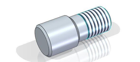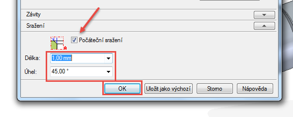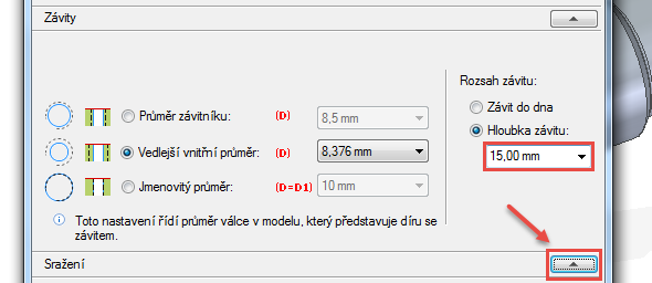 Pokračujte kliknutím na tlačítko Možnostidíry → zobrazí se okno MožnostidíryNastavte závitovou díru (1), velikost závitu M10, hloubku díry 15 mm a v případě potřeby změňte úhel špičky. Pokračujte kliknutím na rolovací šipku (2) v poli ZávityRozbalte nabídku, nastavte hloubku závitu 15 mm a pokračujte kliknutím na rolovací šipku v poli SraženíZatrhněte pole Počátečnísražení, definujte velikost sražení 1 mm a úhel sražení 45 stupňů v polích Délka a Úhel. Provedené úpravy potvrďte OKNajeďte kurzorem na rovinu/plochu, od které bude začínat závit v díře. Klávesou F3 uzamkněte rovinu. Jakmile se objeví symbol Soustředná, vytvoří se automaticky vazby. Kliknutím levým tlačítkem dokončete vytvoření díry se závitemHotový čep s vnitřním i vnějším závitem