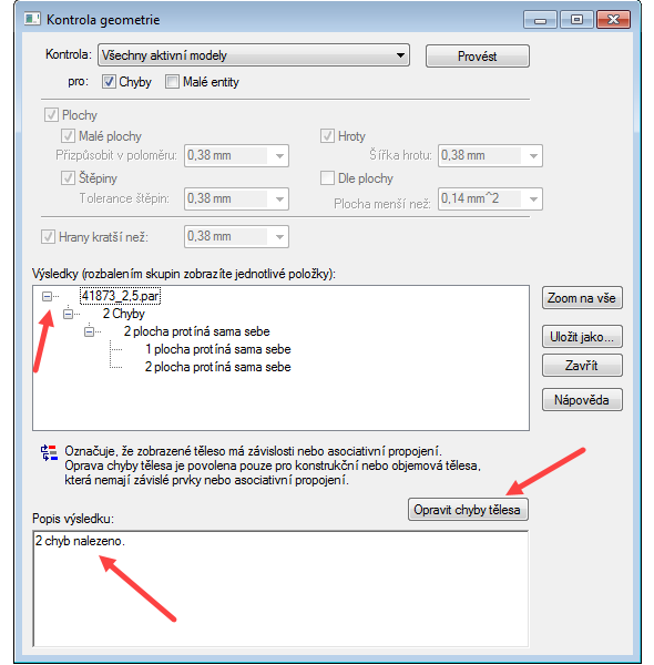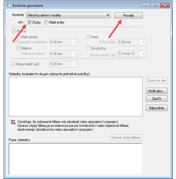 V následujícím okně zaškrtněte políčko Chyby. Pokud chcete zjistit, zda model obsahuje malé entity zaškrtněte i tohle políčko. Kontrolu geometrie spustíte tlačítkem Provést