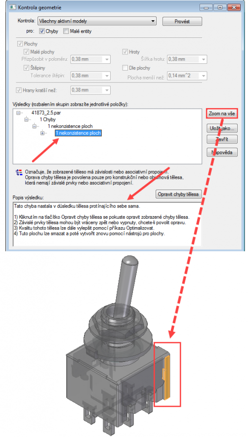 Další příklad chyby: Jedná se o nekonzistenci ploch – tuto chybu již Solid Edge nedokáže opravit, jelikož se jedná o importované těleso. Nabídne však popis důsledku chyby a její možnosti eliminace. Užitečná funkce je Zoom na vše. Po kliknutí na toto tlačítko se zvýrazní plochy, kterých se chyba týká