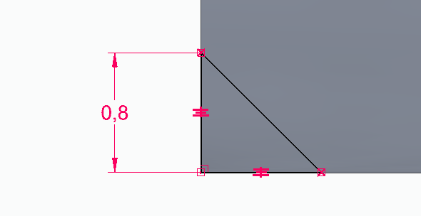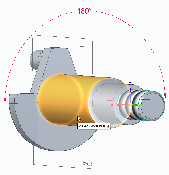 Otevřete si soubor s názvem Klikova_hridel_1.par. Pokud tento soubor nemáte, postupujte podle prvního dílu tohoto návoduNa čele hřídele vytvořte kružnici o velikosti 4 mm jejíž vzdálenost leží 7,5 mm od počátku souřadného systémuSkicu vysuňte do vzdálenosti 6 mmVytvořte skicu na pravém bokorysu (YZ) a přibližte si oblast označenou šipkouNakreslete trojúhelník s délkou a zakótujte stranu o velikosti 0,8 mm. Pro ostatní rozměry trojúhelníku použijte vazbu Shodně. Konstrukční čárou nakreslete čáru v ose rotace hřídele a skicu zavřeteZvolte funkci Vyříznutí rotací a v plovoucím okně zvolte Vybrat ze skici. Klikněte na skicu a potvrďte pravým tlačítkem. Klikněte na osu a potvrďte výběr zeleným tlačítkem. V plovoucím okně nastavte Vyříznutí rotací – Symetricky a zadejte hodnotu úhlu 200°Podle obrázku vytvořte skicu a na ní kružnici o velikosti 4,3 mm, kterou vysuňte do vzdálenosti 2,2 mmZe záložky Domů → Roviny vyberte funkci Tečně a vytvořte novou rovinu tečnou k ploše válce tak, jak je uvedeno na obrázku – s úhlem 180 °V této rovině vytvořte skicu a do ní nakreslete Obdélník dvěma body a zakótujte rozměry podle obrázkuFunkcí Vyříznout udělejte otvor do hloubky 3,2 mmZaoblete zvýrazněné hrany poloměr 1,2 mmK dokončení celé hřídele zbývají zaoblit poslední dvě hrany. Proveďte zaoblení o poloměru 3 mmDefinujte materiál hliník a soubor si uložte pod názvem Klikova_hridel_fin.par