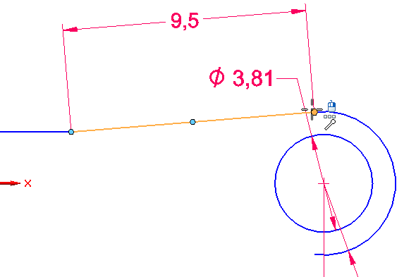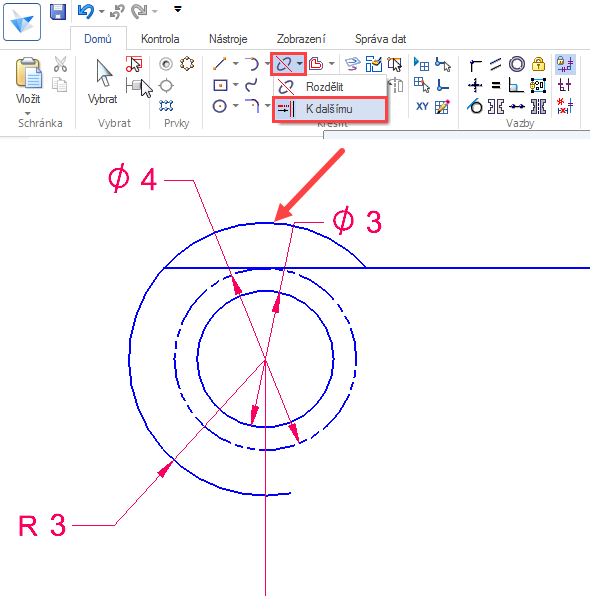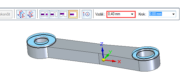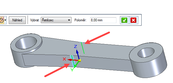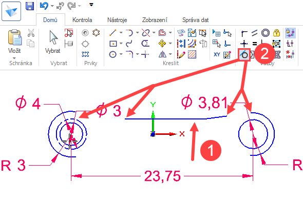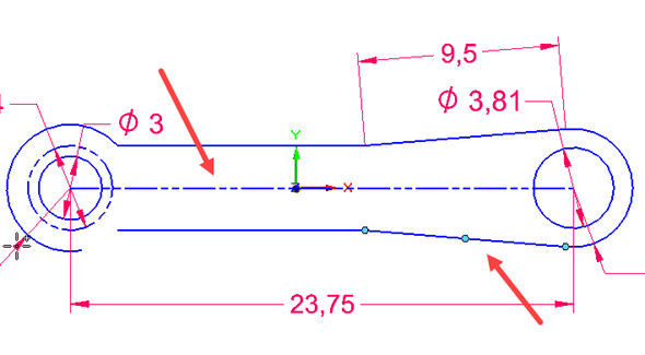 Založte nový dokument iso metric part.par, přepněte se do sekvenčního prostředí a vytvořte skicu na rovinu půdorysu (XY)Nakreslete tři kružnice o průměrech 3, 4 a 3,81 mm podle obrázku. Kružnici o průměru 4 mm přepněte na konstrukční. Středy kružnic vlevo i vpravo leží na ose XZe záložky Domů → Kreslit zvolte funkci Oblouk středem a nakreslete dva oblouky dle obrázkuV dalším kroku nejprve nakreslete lomenou čáru od ruky (1) a v dalším kroku použijte vazbu Tečně (2), kterou aplikujte dle šipek vždy na koncový bodPravou část lomené čáry zakótujte na velikost 9,5 mm a pomocí vazby Připojit ji připojte k obloukuLevou část čáry připojte k oblouku a funkcí K dalšímu oblouk protáhněte na úroveň čáryČáru pod obloukem odřízněte pomocí funkce Oříznout dle obrázku. Na ose X nakreslete konstrukční čáru, která bude sloužit jako osa symetrie pro funkci Zrcadlení tuto funkci aplikujte na lomenou čáruVazbou Připojit spojte oblouk se zrcadlenou čárou a skicu zavřeteSkicu vysuňte o 2,5 mmVytvořte novou skicu na horní ploše ojnice a nakreslete nebo promítněte kružnice dle obrázkuSkicu zavřete a vysuňte prvky o 0,4 mmTo samé proveďte na druhé straně a zaoblete naznačené přechody na hodnotu poloměru 8 mmZelené hrany zkoste funkcí Zkosení na hodnotu 0,7 mmMalá ojnice je hotová. Na ojnici se ještě může přidat kapsa pro odlehčení – s ohledem na její velikost to není nutné. Soubor si uložte pod názvem ojnice_mala_fin.par