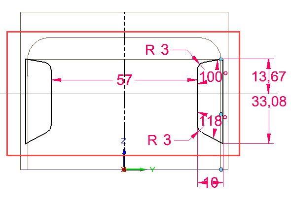 Zakótujte dle obrázku a nakreslete uprostřed tělesa konstrukční pomocnou čáru, ta bude sloužit pro zrcadlení v následujícím krokuZe záložky Domů→ Kreslit vyberte funkci Zrcadlit a duplikujte skicu poté nastavte kótu mezi jednotlivými entity na hodnotu 57 mm a skicu zavřete