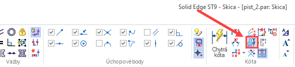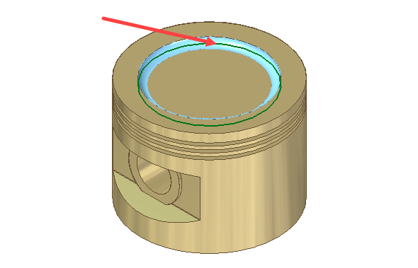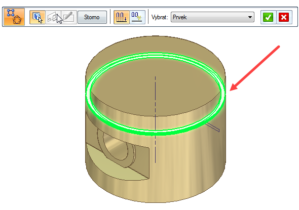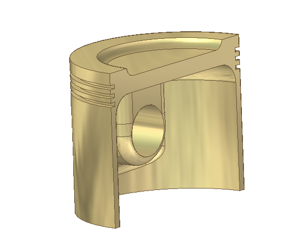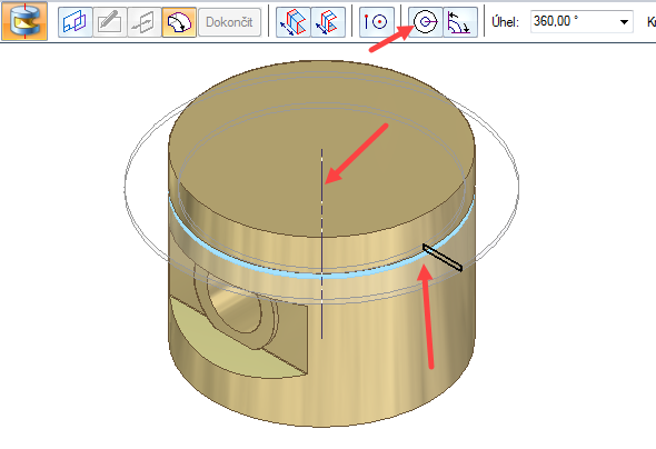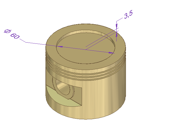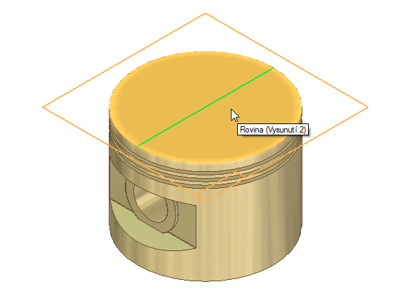 Otevřete si uložený dokument pist_2.par vymodelovaný dle minulého návoduBudeme pokračovat aplikováním zaoblení vyznačených hran (červená šipka) ze spodu pístu o velikosti 5 mmNa pístu stále chybí vytvořit drážky pro těsnící pístní kroužky. Vytvořte skicu na rovině Nárysu (XZ) a přepněte se do drátového modeluDo pravé části pístu nakreslete obdélník a zakótujte jeho svislou pozici a šířku dle obrázku, dále vytvořte středovou osu pístu funkcí Čára a přepnout na KonstrukčníZe záložky Domů → Kóta zvolte funkci Kóta průměruKlikněte na vytvořenou osu a levou stranu obdélníku, tím vytvoříte kótu průměru pro těsnící kroužky. Zvolte velikost 76 mm a zavřete skicuZe záložky Domů → Tělesa zvolte funkci Vyříznutí rotací a klikněte na skicu a poté na osu v plovoucím okně. Buď zvolte Otočit o 360 ° nebo zadejte velikost úhlu 360 °Vyvolejte funkci Pole ze záložky Domů → Pole, vyberte prvek, který jste vytvořili a potvrďte zeleným tlačítkem. Pro výběr roviny v dalším kroku vyberte rovinu Pravý bokorys (YZ)Pro nakreslení pole využijte levý úchopový bod na drážce pro kroužek a od ruky nakreslete obdélník dle obrázkuV plovoucím okně nastavte typ pole na Pevné a hodnotu Y na 3,5 mm. Tím vymezíte jednotlivé rozestupy těsnících kroužků a dejte zavřít skicuPosledním krokem nutné konstrukce pístu je vytvoření spalovací prohlubně. Pro vytvoření prohlubně zvolíme funkci Vyříznout a rovinu na čele pístuNakreslíme kružnici o průměru 60 mm a následně ji vyřízneme směrem dolů o velikosti 3,5 mmProhlubeň už jen zaoblíme na velikost 4 mmJednoduchý píst je hotový. Dokument si uložte pod názvem pist_fin.par