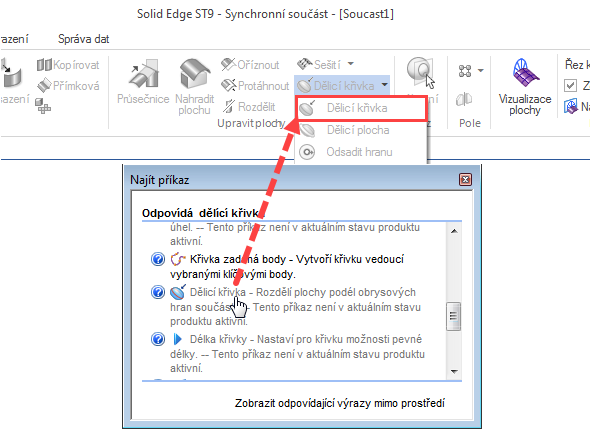 Založte nový dokument iso metric part.par nebo otevřete existující dokumentFunkci Vyhledávání najdete v pravé dolní liště. Do pole Najít příkaz napište hledaný výraz…… například „dělící křivka“ a potvrďte text klávesou ENTER (nebo klikněte na šipku vpravo)Objeví se okno, kde jsou všechny možné varianty slov „dělící“ a „křivka“. Výhodou je, že stačí najet kursorem na daný příkaz a v řešení Solid Edge se automaticky zobrazí jeho cesta a zvýrazní příkaz, který hledáte